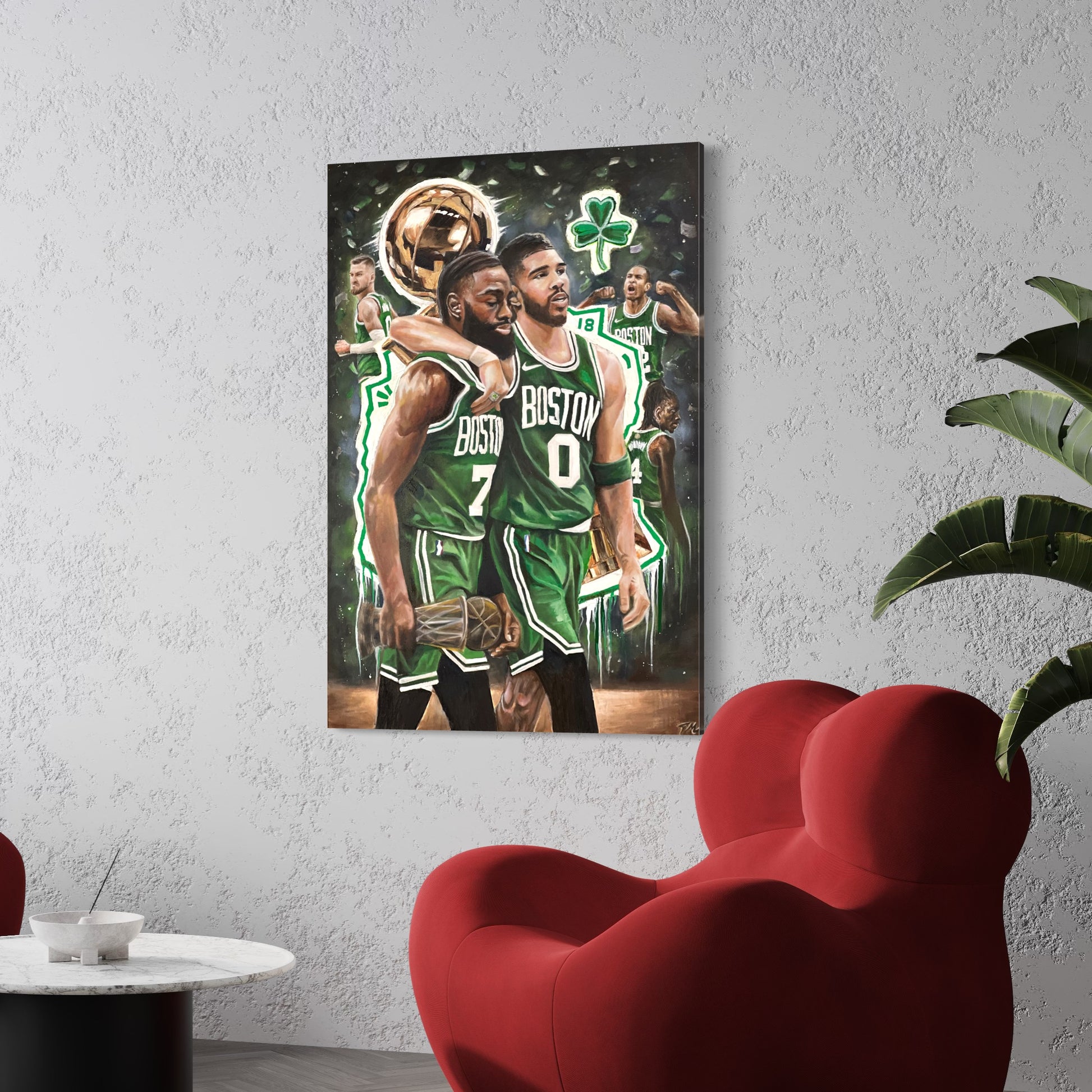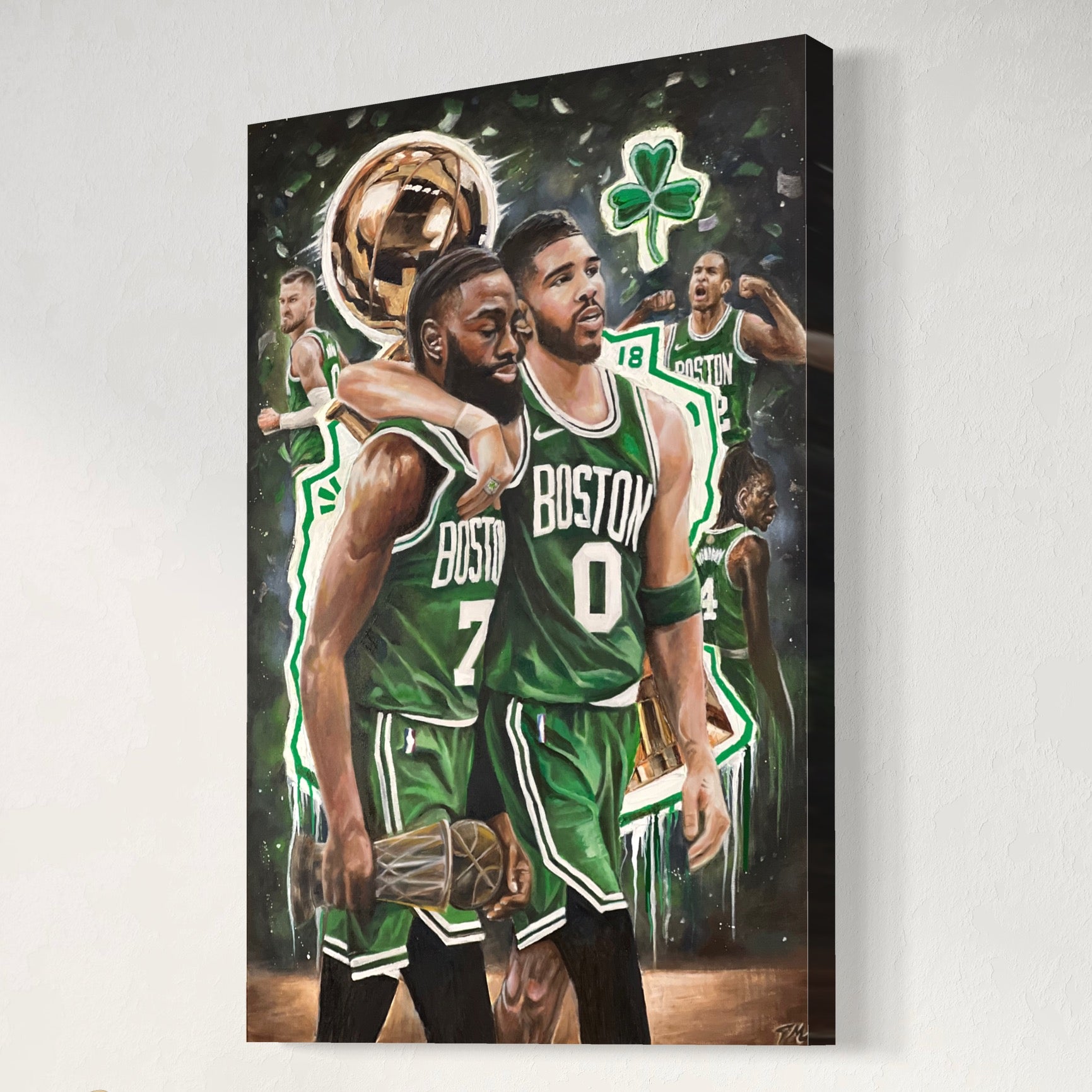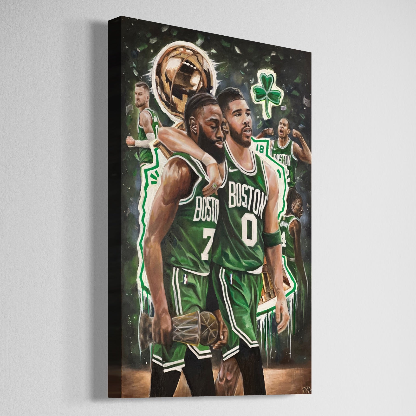 Immerse your space with artwork of Jayson Tatum and Jaylen Brown by Tommy Manning. Elevate your space with hand-painted Celtics artwork, showcasing the iconic moment. Each high-quality print captures the championship mentality and inspirational legacy, perfect for fans and sports enthusiasts. These vibrant, durable canvases make a striking addition to any room, celebrating the greatness of the Boston Celtics with style and passion.