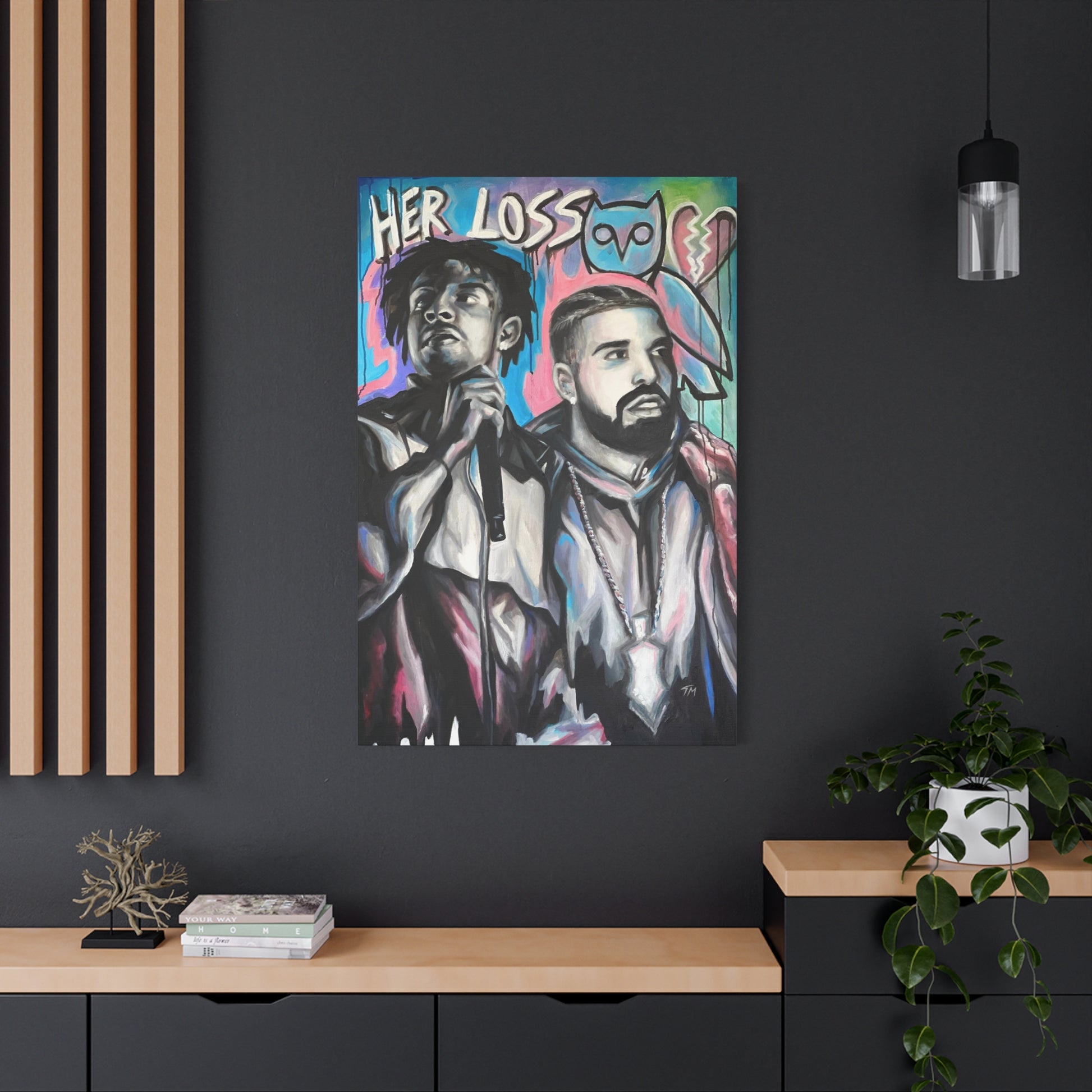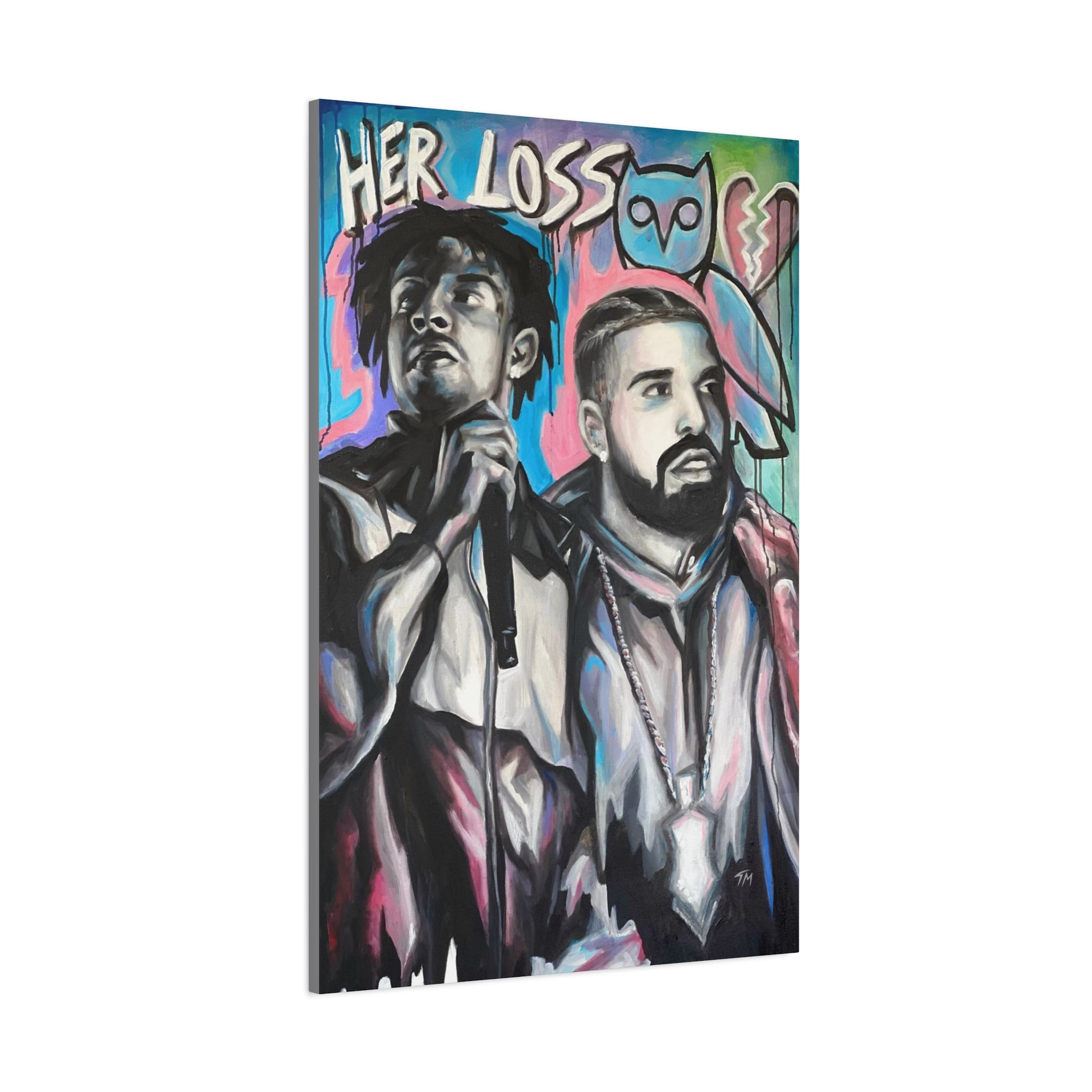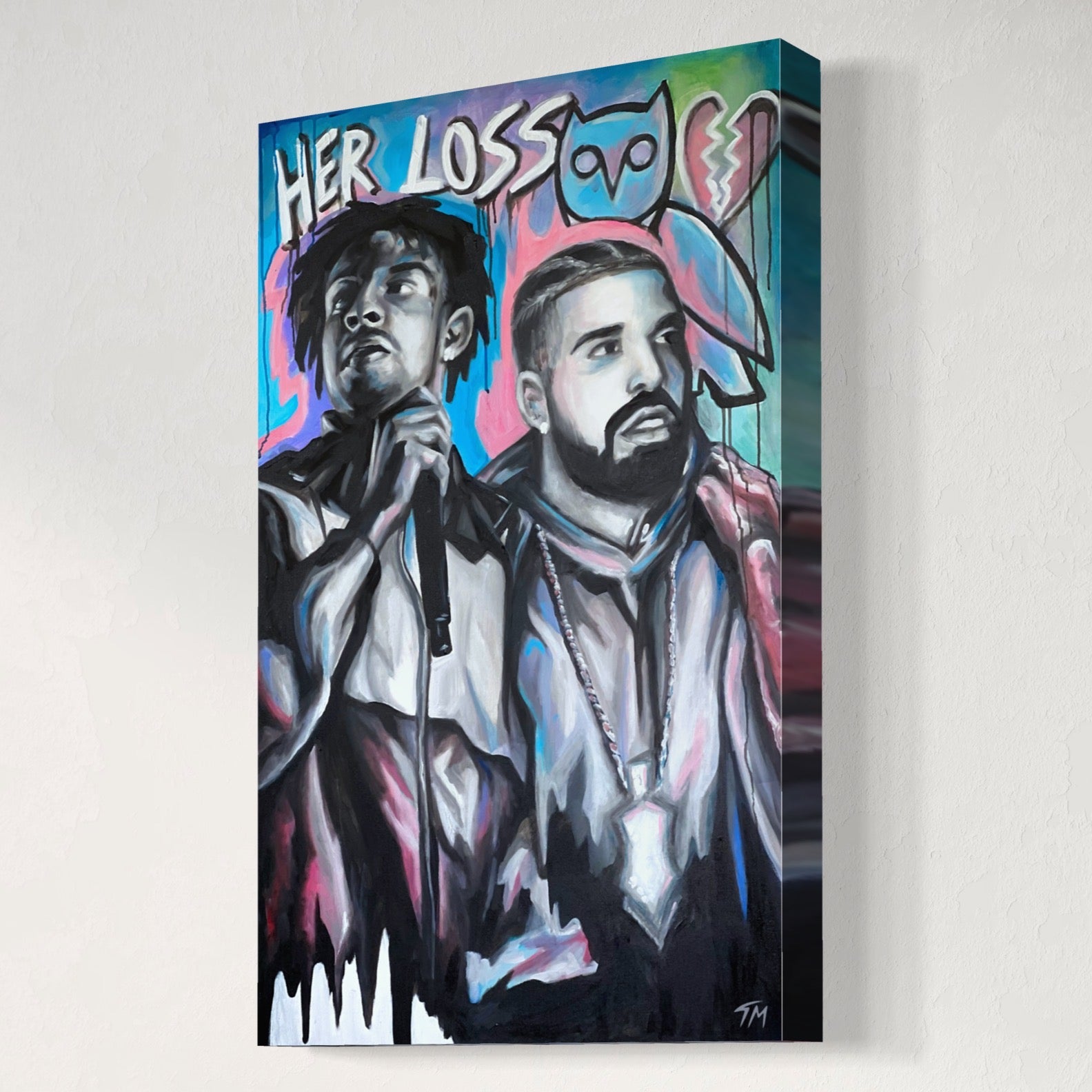 Immerse your space with artwork of Tommy Manning Drake and Savage Her Loss Canvas Wall Art Prints with our ready-to-hang Canvas Prints. Elevate your walls with this hand-painted masterpiece, blending artistry and ambiance. Celebrate contemporary hip-hop excellence with the Drake and Savage Her Loss Canvas Wall Art Prints. This dynamic artwork captures the essence of their collaborative album, "Her Loss," perfect for fans of Drake and 21 Savage. High-quality and visually captivating, this canvas print adds a modern and stylish touch to your home or office decor, honoring the impactful partnership of these influential artists.