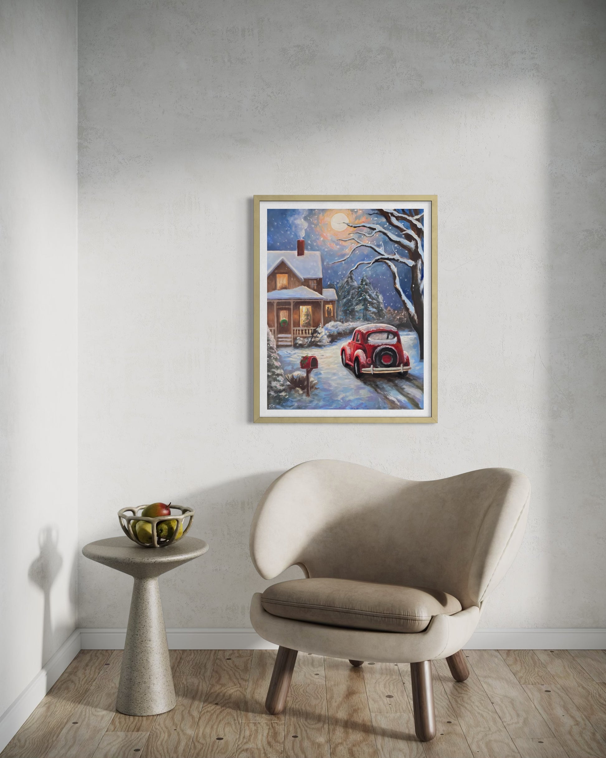 This piece captures the feeling of pulling into the driveway after a long year — lights glowing, snow falling, and the comfort of knowing you’ve made it home. It’s calm, nostalgic, and instantly familiar.