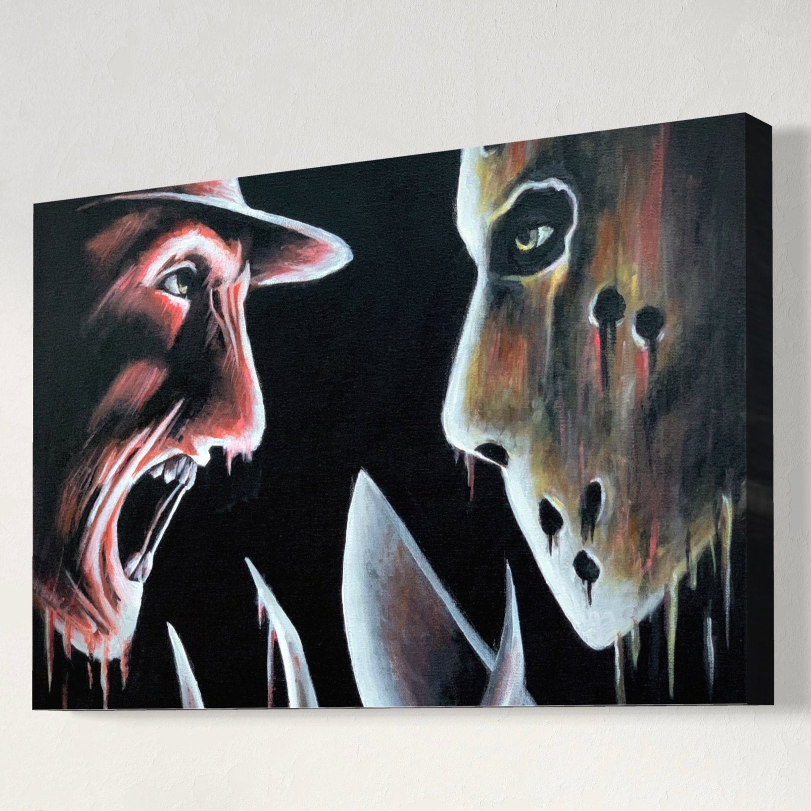 Immerse your space with artwork of Tommy Manning Freddy Krueger & Jason Voorhees FREDDY VS JASON Canvas Wall Art Prints with our ready-to-hang Canvas Prints. Elevate your walls with this hand-painted masterpiece, blending artistry and ambiance. Freddy Krueger & Jason Voorhees FREDDY VS JASON Canvas Wall Art Prints feature high-quality images of the iconic horror movie antagonists in their epic showdown. Printed on durable canvas for lasting impact, these prints are perfect for horror fans and collectors. Ready-to-hang, they offer a thrilling and stylish way to bring the suspense and terror of Freddy vs. Jason into any space.