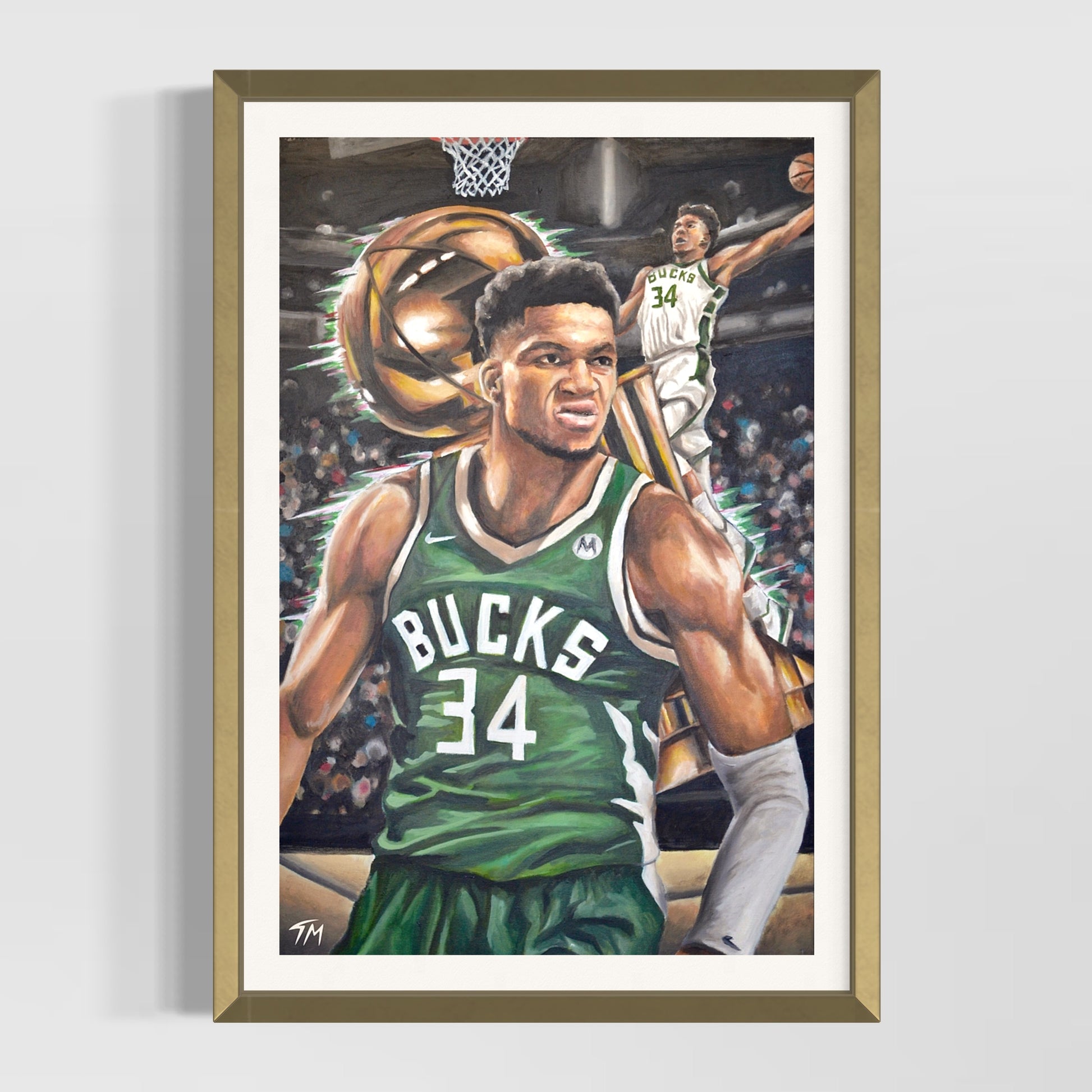 Immerse your space with artwork of Giannis Antetokounmpo by Tommy Manning, with our ready-to-hang Poster Prints. Elevate your walls with this hand-painted masterpiece, blending artistry and ambiance. Showcase your admiration for basketball greatness with Giannis Antetokounmpo Poster Wall Art Prints. Featuring high-quality, dynamic images of the NBA star, these prints add a bold and inspiring element to any space. Available in various sizes, each piece is printed on durable canvas and ready to hang, ideal for fans and sports enthusiasts.