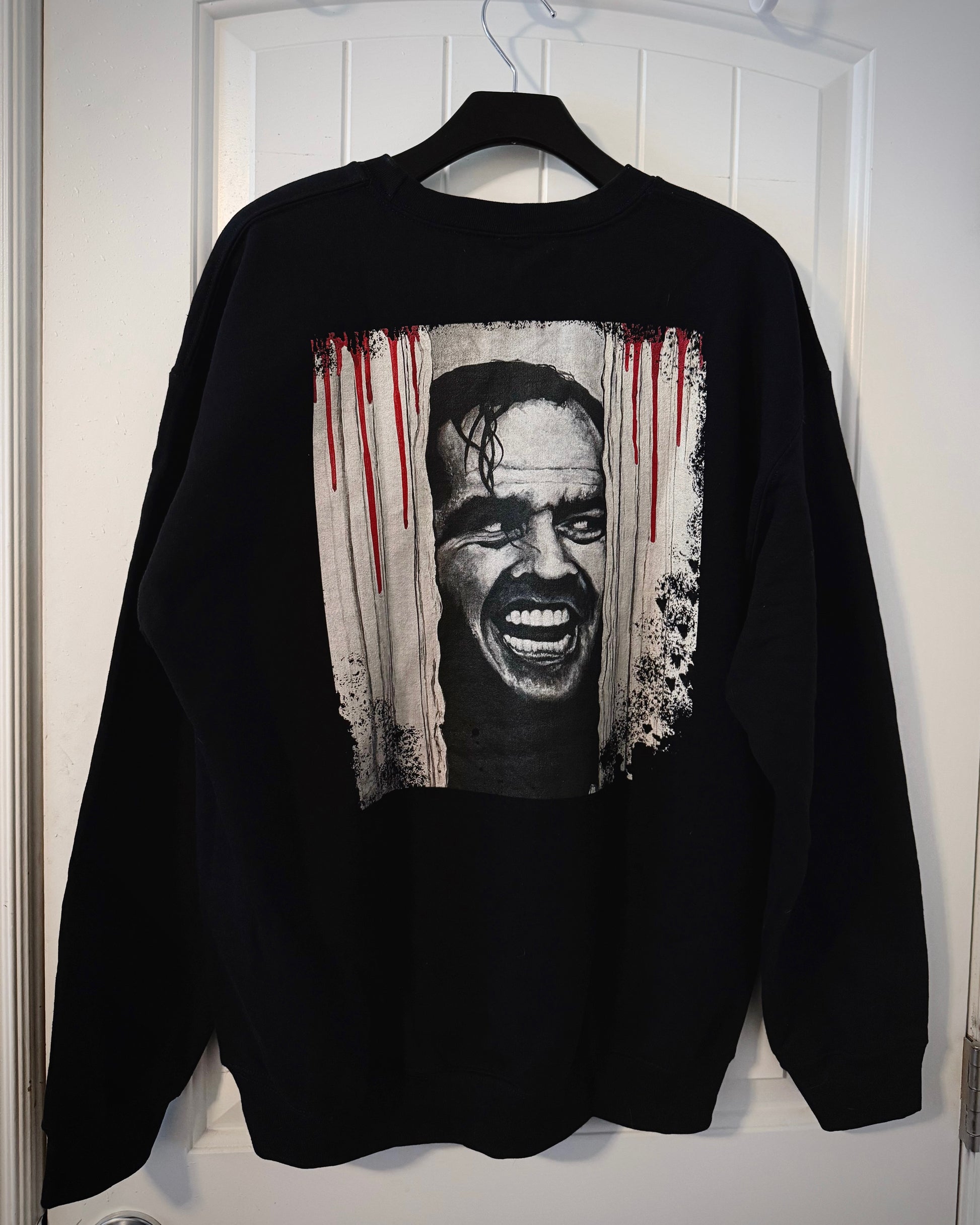 A cozy and comfortable crewneck sweatshirt featuring a design inspired by Jack from 'The Shining' with the iconic word 'REDRUM'. Perfect for horror fans looking to showcase their love for the classic movie. Ideal for Halloween, movie nights, or everyday wear.