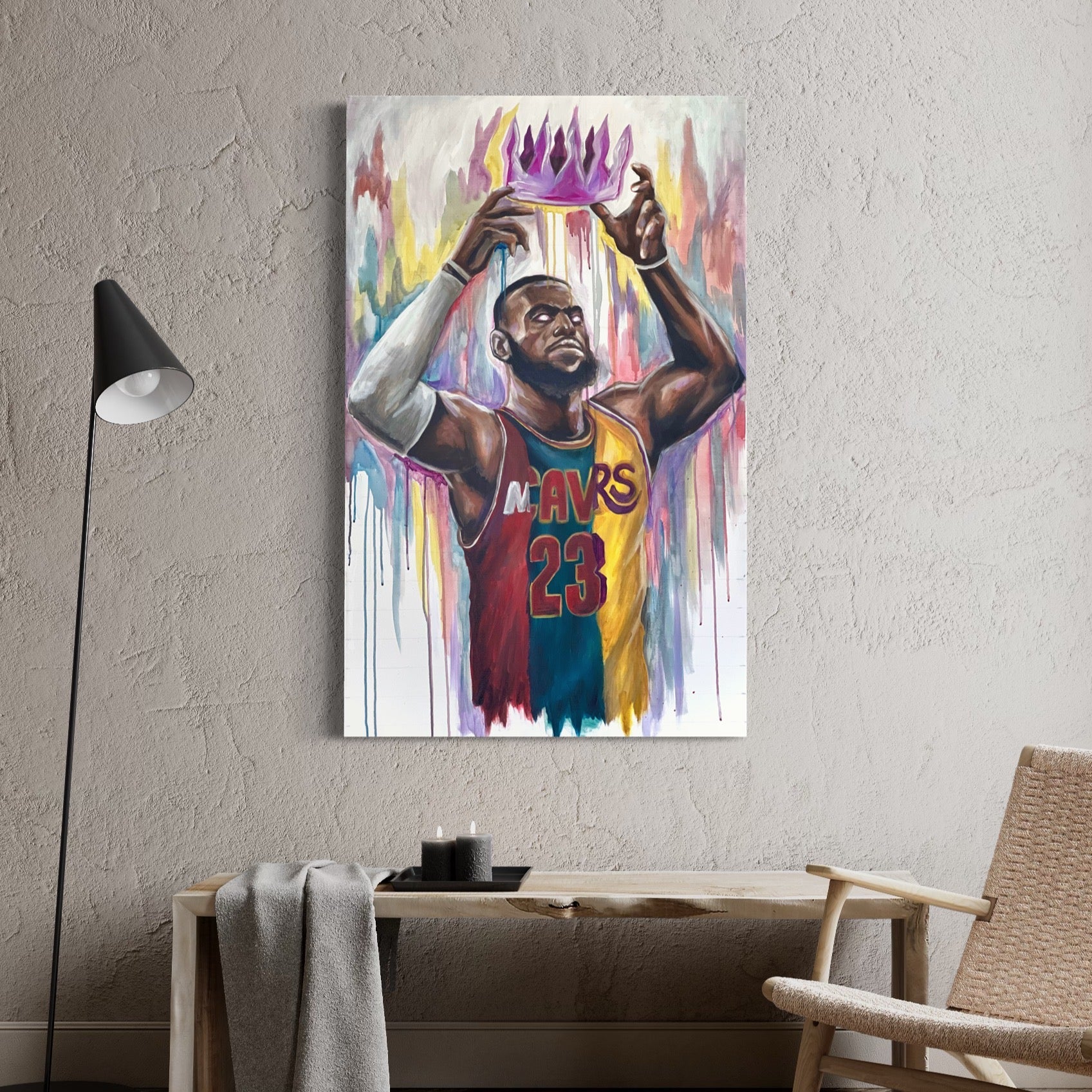 Immerse your space with artwork of Tommy Manning LeBron James King James Canvas Wall Art Prints with our ready-to-hang Canvas Prints. Elevate your walls with this hand-painted masterpiece, blending artistry and ambiance. Celebrate basketball royalty with the LeBron James King James Canvas Wall Art Prints. This striking artwork captures the dominance and skill of one of the NBA's greatest players, perfect for fans and admirers of LeBron James. High-quality and visually impactful, this canvas print adds an inspiring and dynamic touch to your home or office decor, honoring the legacy of the basketball king.