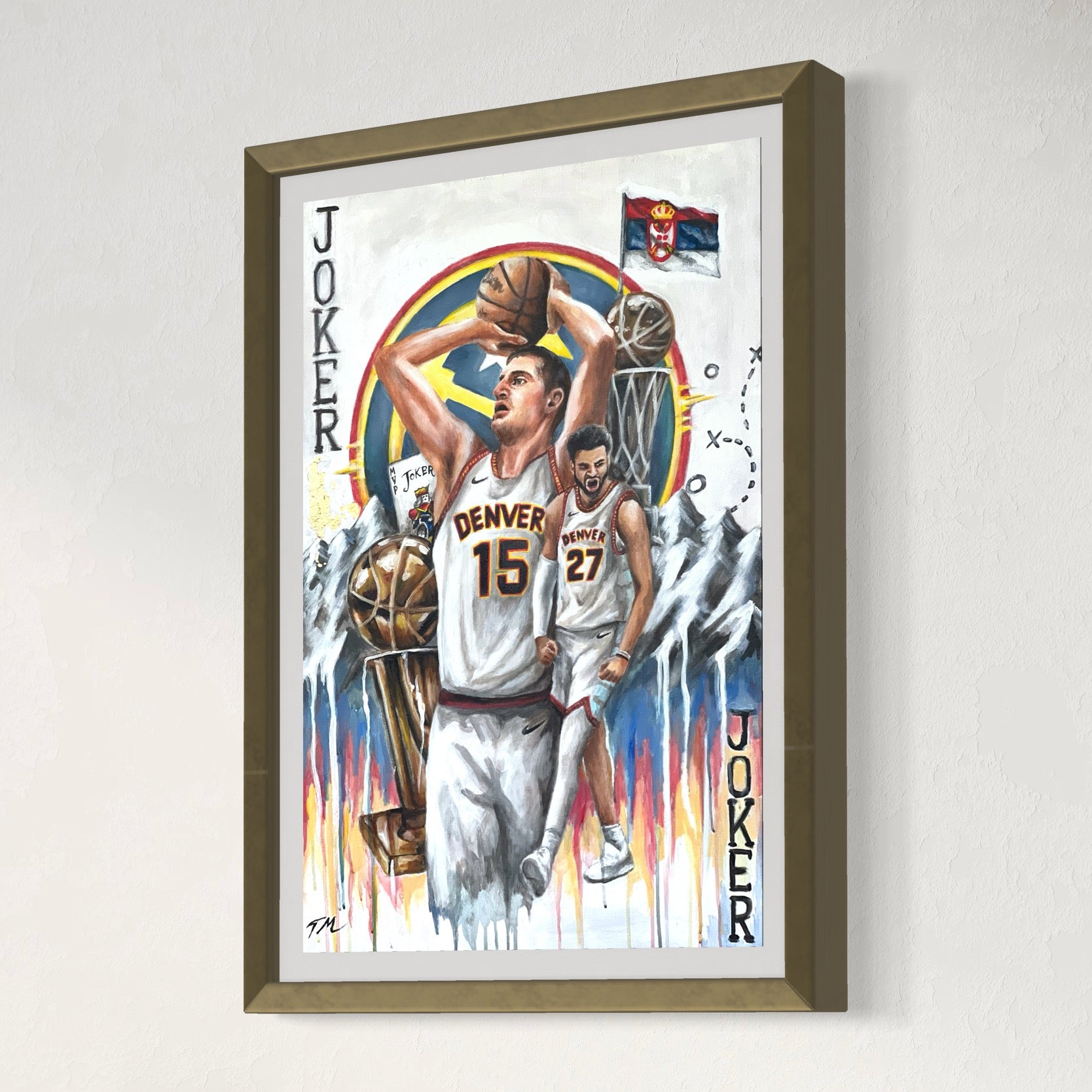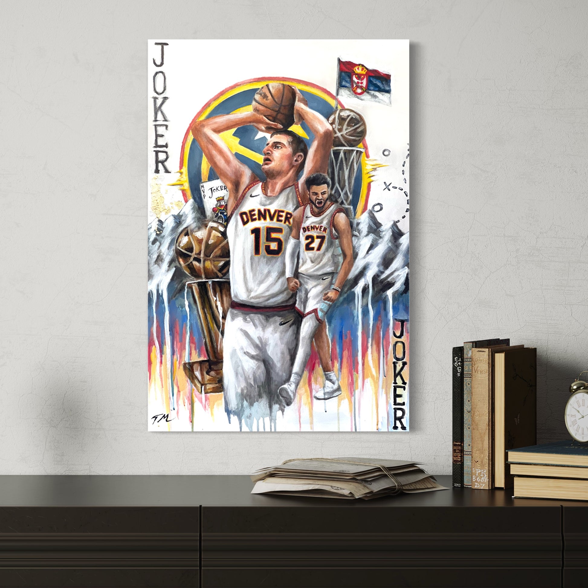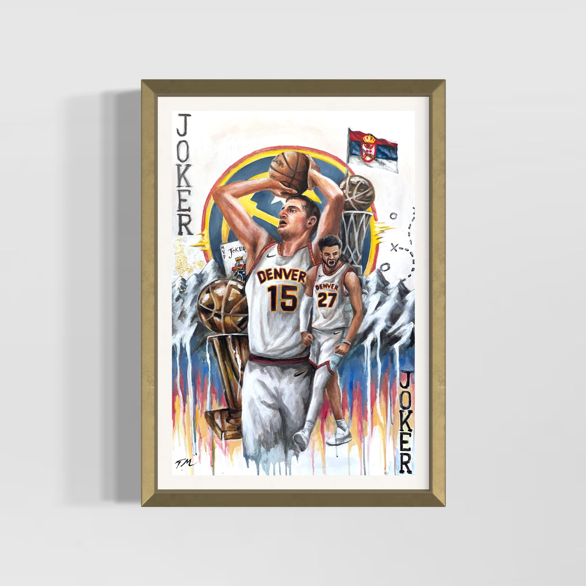 Immerse your space with artwork of Nikola Jokic Champions Denver Nuggets by Tommy Manning, with our ready-to-hang Poster Prints. Elevate your walls with this hand-painted masterpiece, blending artistry and ambiance. Celebrate the triumph of the Denver Nuggets with the Nikola Jokic Champions Poster Wall Art Prints. This stunning artwork features MVP Nikola Jokic, capturing the exhilaration of the Nuggets' championship victory. Perfect for basketball fans and admirers of Jokic's extraordinary talent, this high-quality canvas print adds a vibrant and inspiring touch to your home or office decor, commemorating a landmark moment in NBA history.