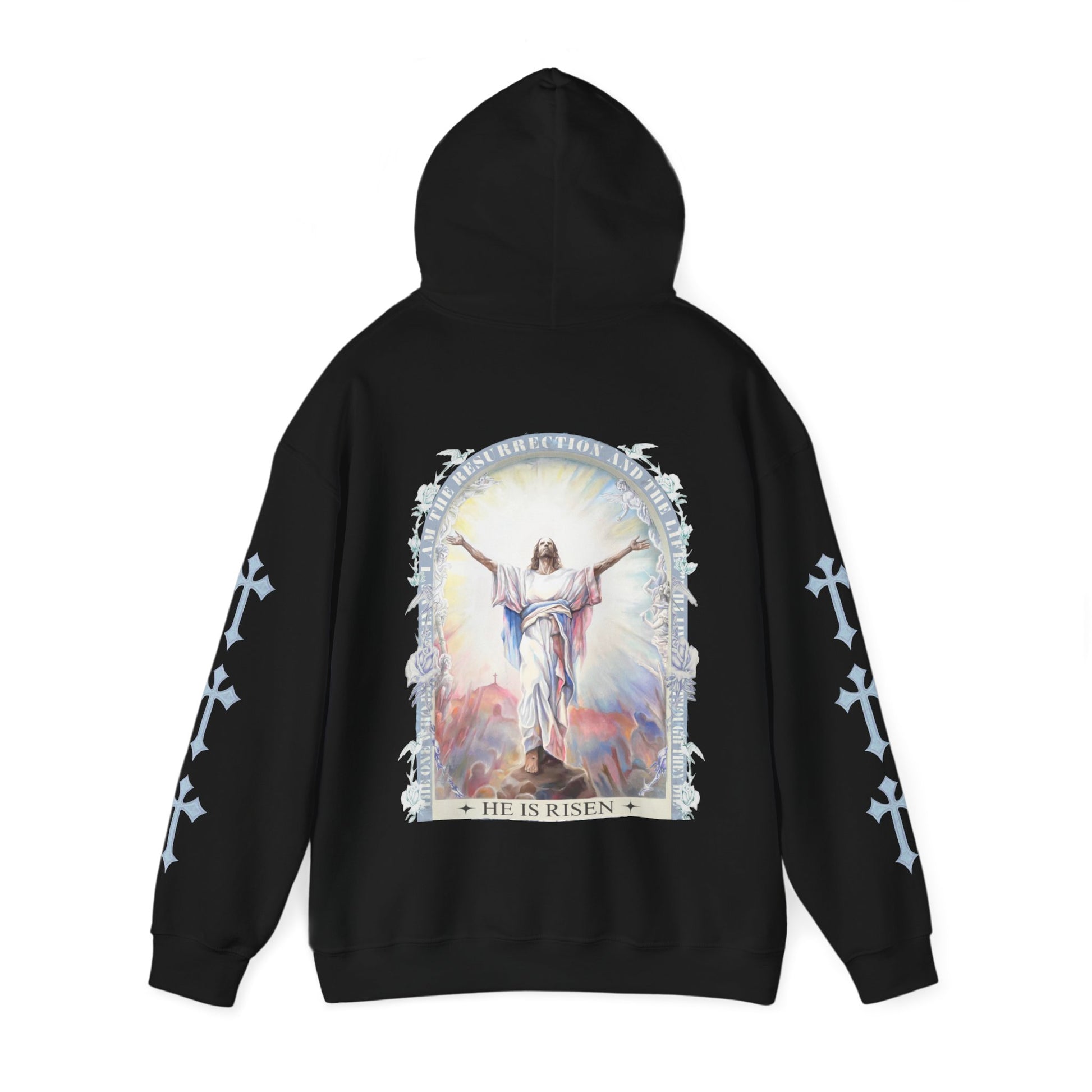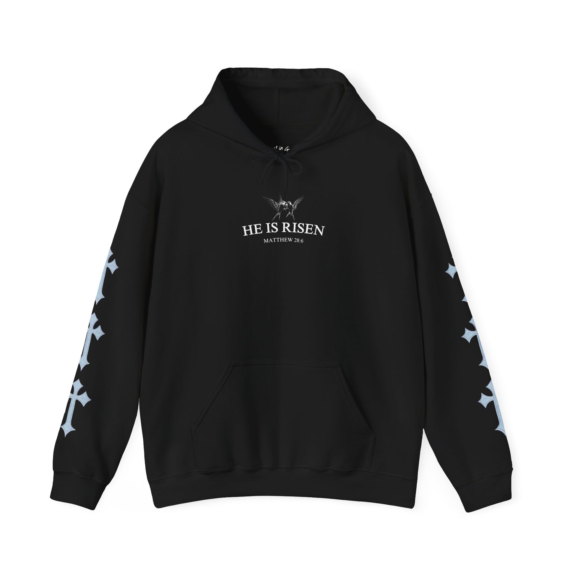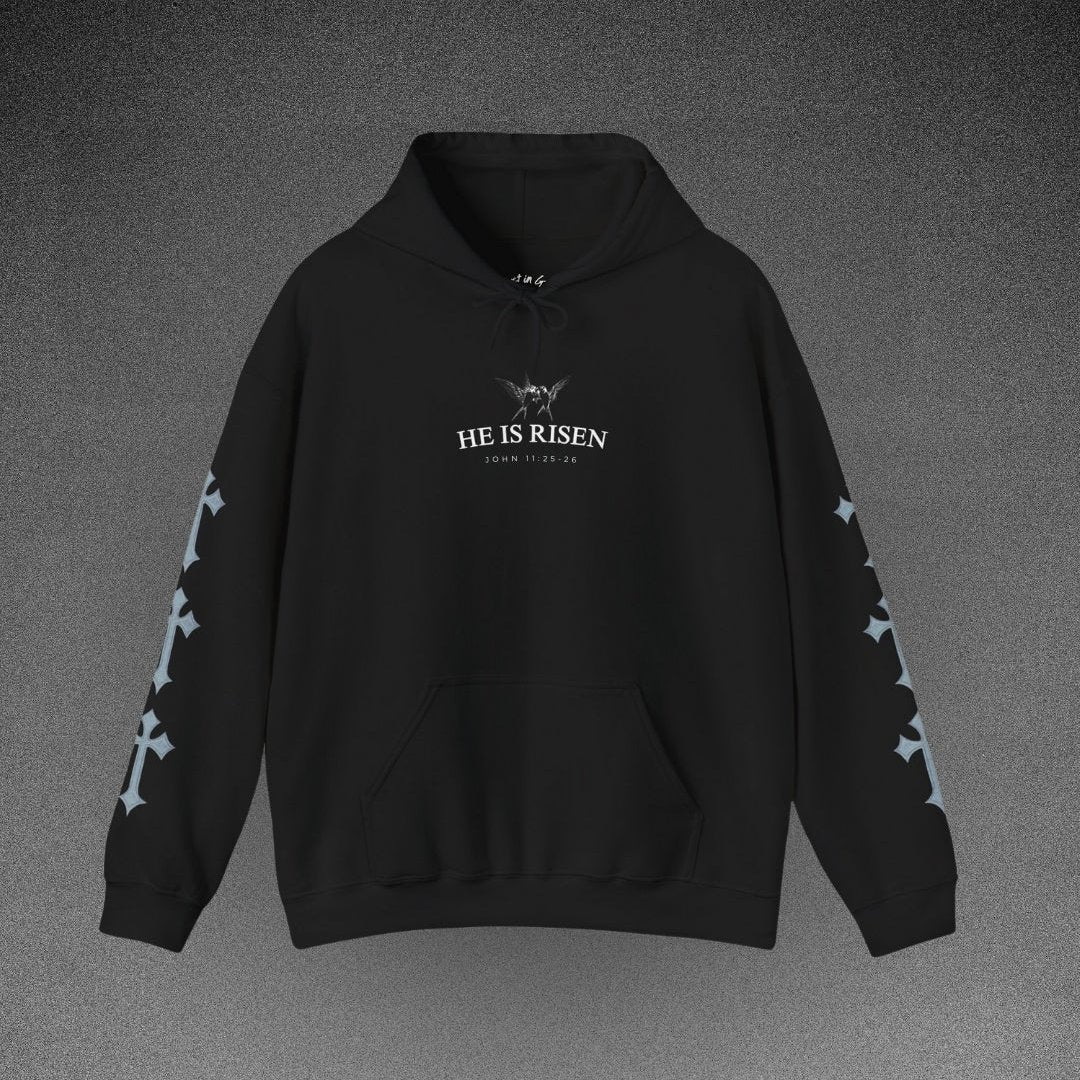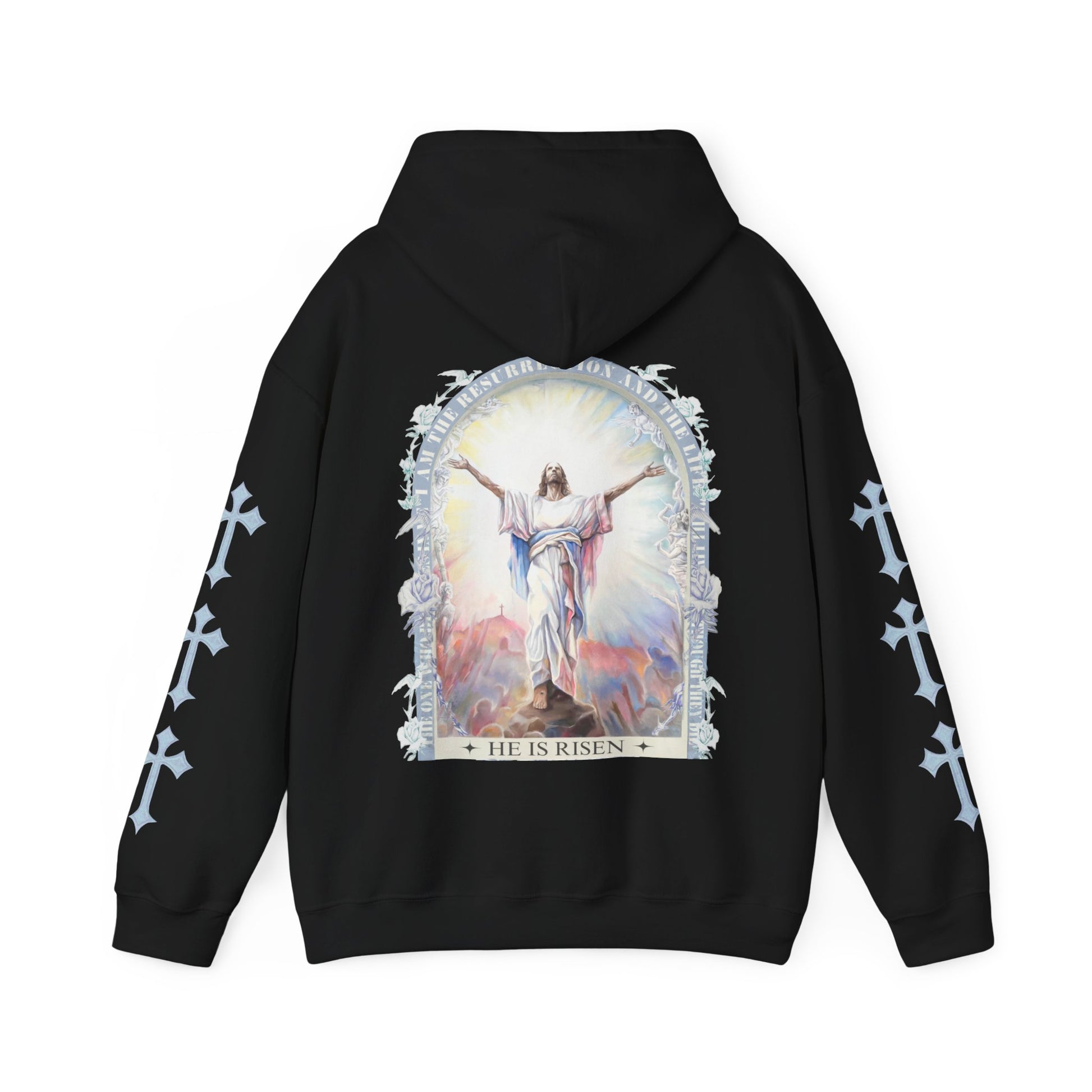 This 'he is risen' hoodie celebrates Jesus resurrection, perfect for those who want to showcase their faith and religious beliefs. It provides a cozy feel and warmth, making it ideal for chilly days. The classic fit and spacious pockets add both comfort and functionality to your wardrobe. The design is relevant for Easter celebrations and for individuals who want to express their Christian faith.